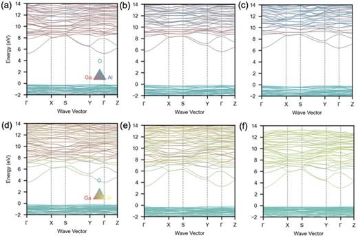 FIG. 3. Band structure of a (001) Al2O3/κ-Ga2O3 superlattice with varied layer thicknesses: 1 ML/3 ML (a), 2 ML/2 ML (b), 3 ML/1 ML (c), and In2O3/κ-Ga2O3 superlattices with 1 ML/3 ML (d), 2 ML/2 ML (e), and 3 ML/1 ML (f).
