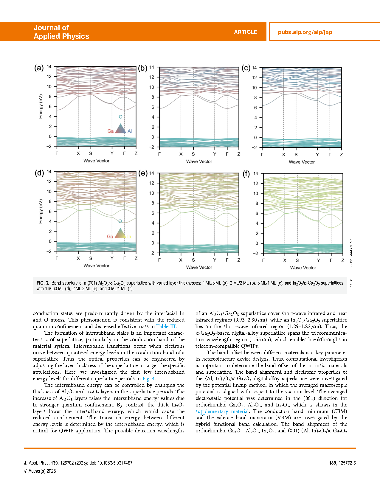 In summary, we performed first-principles DFT calculations to investigate the structural and electronic properties of a κ-Ga2O3-based digital-alloy superlattice. We demonstrated that the bandgap can be tuned over a wide range (3.32–6.65 eV) by varying the ML thickness of Al2O3 and In2O3 insertions, overcoming the phase separation challenges typical of random ternary alloys. The calculations reveal that intersubband transition energies can be engineered to target the telecommunication wavelength (1.55 μm). Furthermore, the adjustable conduction band offset (up to 3.71 eV) in Al2O3/κ-Ga2O3 systems highlights their potential for high confinement 2DEGs in HEMT application. These results establish κ-phase digital alloys as a viable and flexible platform for next-generation oxide electronics and optoelectronics.