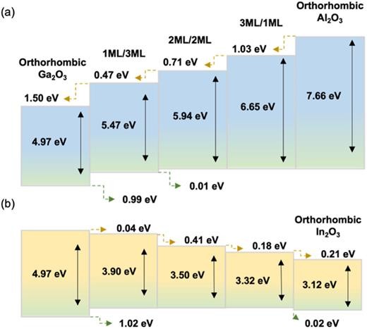 FIG. 5. Band alignment of a (001) Al2O3/κ-Ga2O3 superlattice (a) and a (001) In2O3/κ-Ga2O3 superlattice (b).