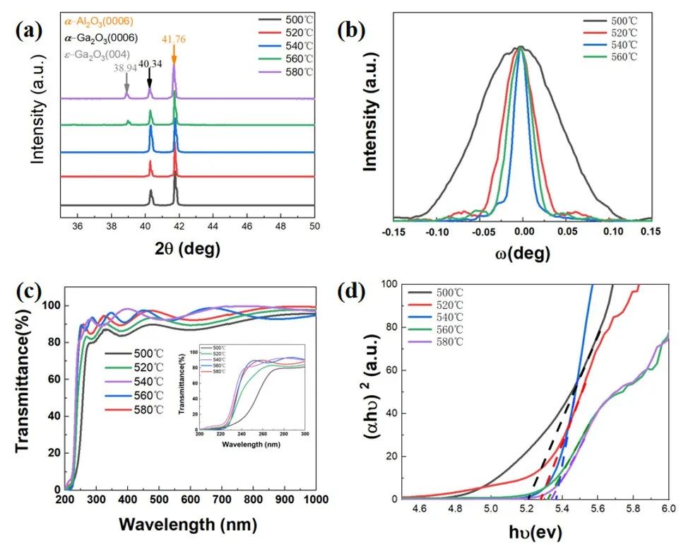 Figure 1. (a) XRD spectrum of α -Ga2O3 epitaxial film powder prepared at sapphire substrate position z=50mm, growth temperature 500-580℃, (b) (0006) crystal surface rocking curve, (c) penetration spectrum, (d) optical band gap.
