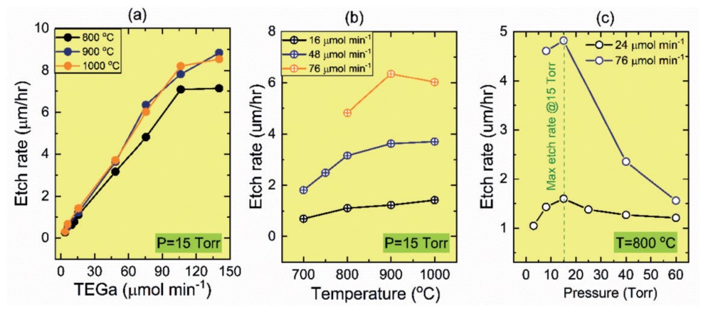 Another influencing factor for increasing the etching rate is the substrate temperature. Higher temperatures will speed up the etching rate, but only to a certain extent, with saturation occurring above 900 ° C. When saturation occurs, the etching rate at saturation depends on the TEGa molar flow rate (see Figure 2(b)). When the substrate temperature is below 800 ° C, the etching rate is limited by the low oxide reaction rate rather than by the TEGa flow rate provided. In this case, an increase in substrate temperature will result in a higher etching rate, and excess gallium will be present on the substrate surface. This is the other way around at higher temperatures, resulting in the consumption of all supplied gallium in a low oxidation reaction. The etching rate is then limited by the TEGa flow rate provided, resulting in saturation of the etching rate. The pressure in the MOCVD reaction chamber also affects the etching rate (see Figure 2(c)). The maximum etching rate occurs at 15Torr.