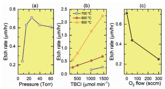 Figure 8. The etching rate of β- Ga2O3 on sapphire as a function of the etching parameters when TBCl etching agent is used. (a) Relationship between etching rate and chamber pressure at substrate temperature of 800°C and TBCl molar flow rate of 1450 μmol/min. (b) Relationship between etching rate and TBCl molar flow rate at constant pressure of 25 Torr and substrate temperature of 700°C, 800°C, 900°C. (c) Relationship between etching rate and oxygen flow rate at 25 Torr constant pressure and 1026 μmol/min TBCl molar flow rate.