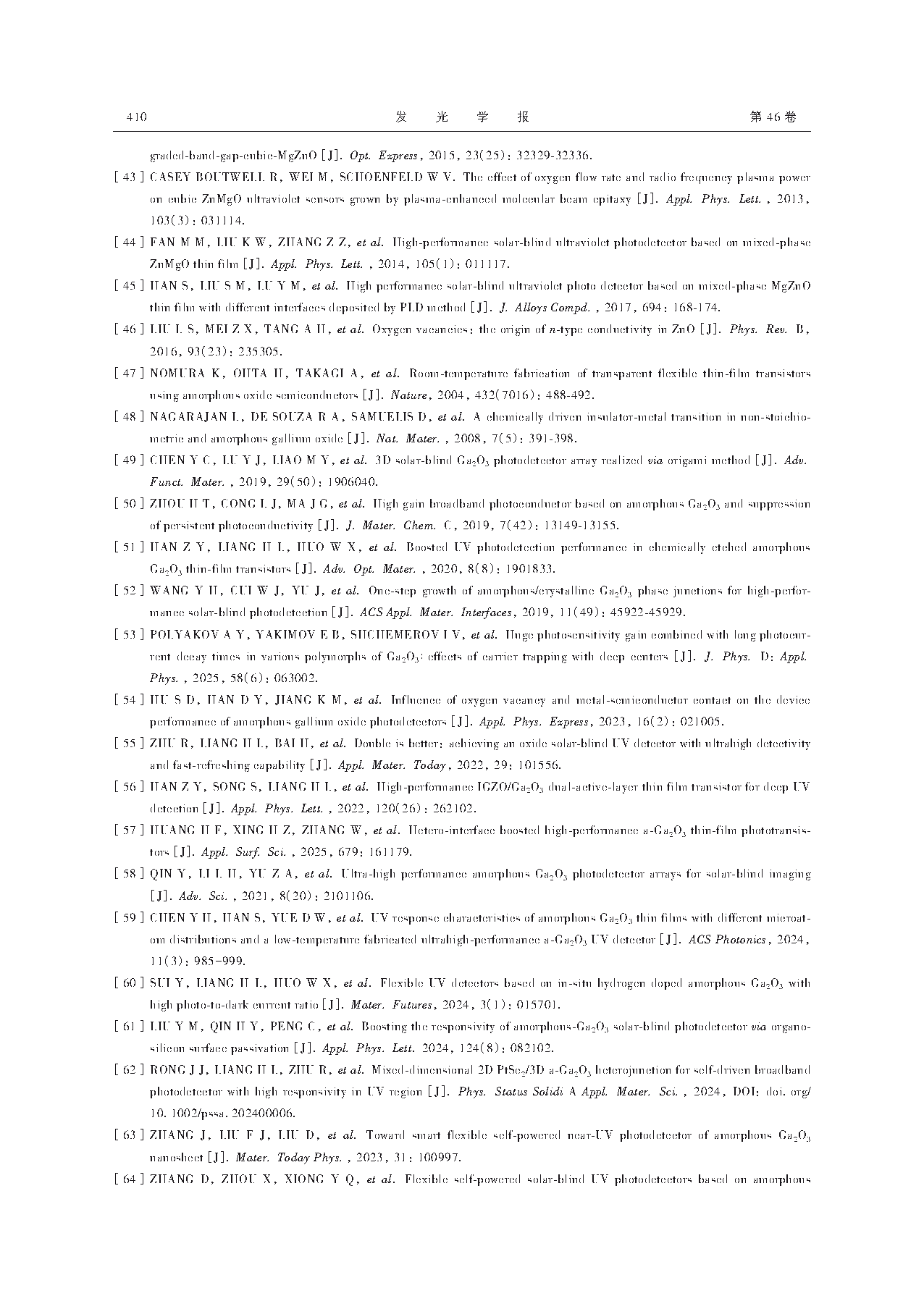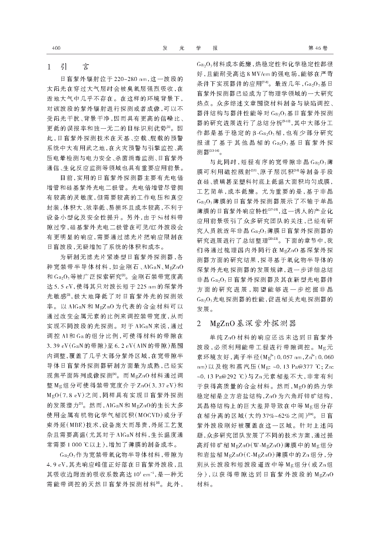 宽带隙半导体在研制无滤光片紧凑型日盲紫外探测器方面具有极大的发展潜力。本文结合本团队在分子束外延 MgZnO 单晶薄膜和磁控溅射非晶 Ga2O3 薄膜以及相应日盲紫外探测器的研究经验,综述了以 MgZnO 和非晶 Ga2O3 为代表的宽带隙氧化物半导体深紫外探测器研究进展,发现非晶 Ga2O3 薄膜拥有不输于单晶薄膜的深紫外响应特性。众多研究结果表明,氧空位相关缺陷对器件性能起着至关重要的作用,对其进行合理调控可有效提升器件性能。此外,与氧空位缺陷相伴的持续光电导效应为开发深紫外光电突触器件提供了新的研究视角。最后,针对上述研究中存在的问题进行剖析总结,期望进一步推动宽带隙氧化物半导体材料,尤其非晶 Ga2O3 材料在未来深紫外探测方面的产业应用。