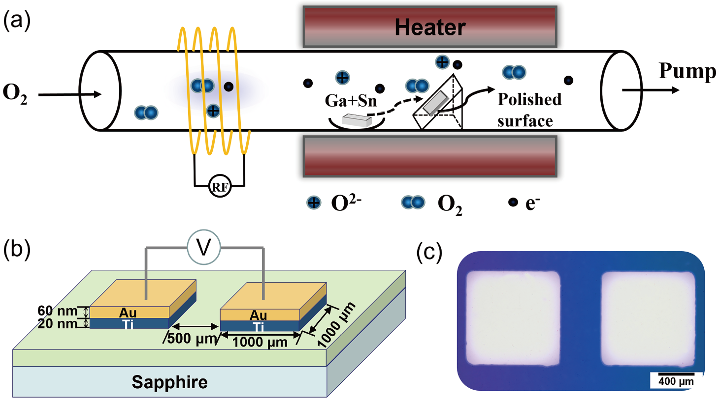 Figure 1. (a) Schematic diagram of the PECVD system. (b) Structure diagram and (c) top-view microscopy image of the fabricated Sn-doped Ga2O3 film-based PD.