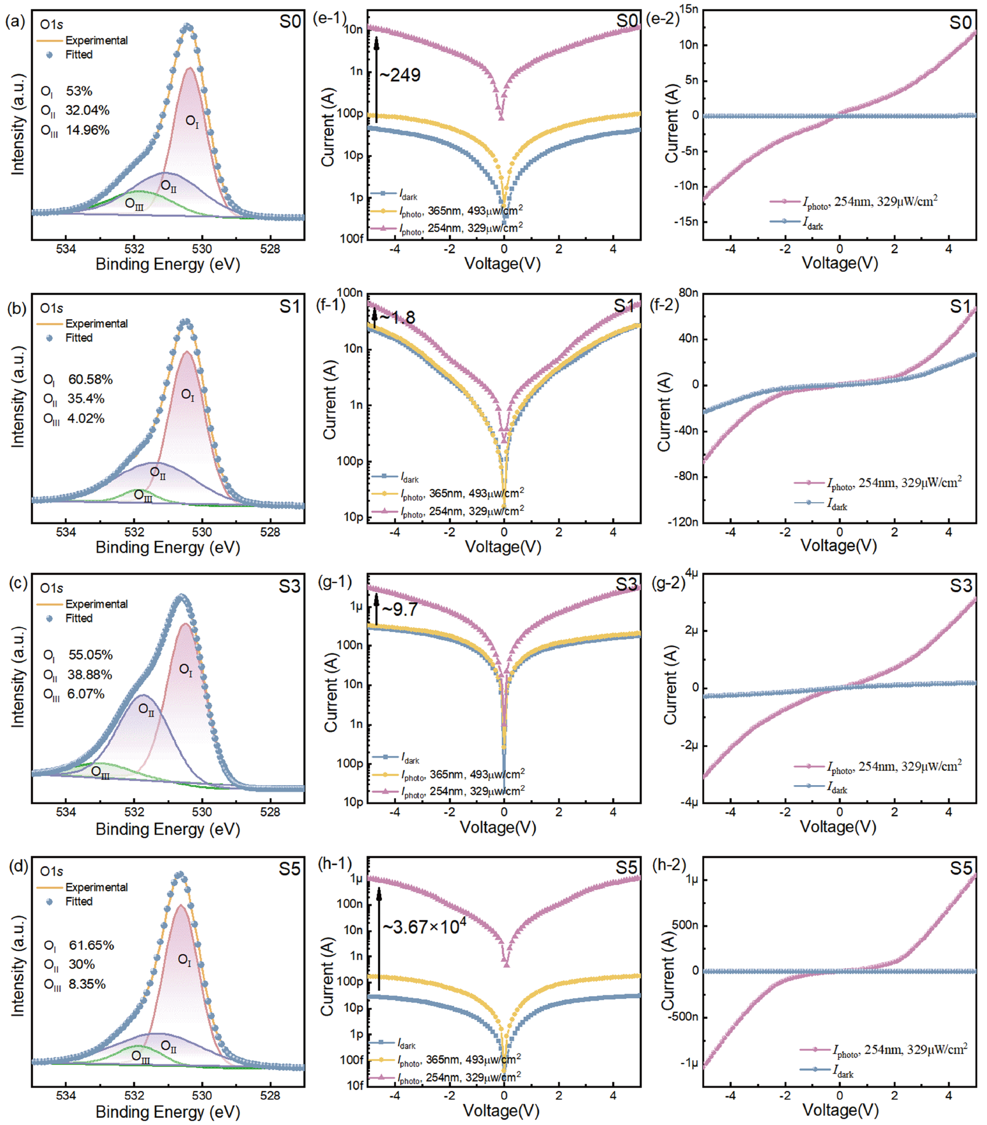 Figure 2. O 1s high-resolution XPS spectra of (a) S0, (b) S1, (c) S3, and (d) S5 samples. The log-scale (1) and linear (2) I-V characteristics of the corresponding (e) S0, (f) S1, (g) S3, and (h) S5 devices under dark conditions and light illumination.