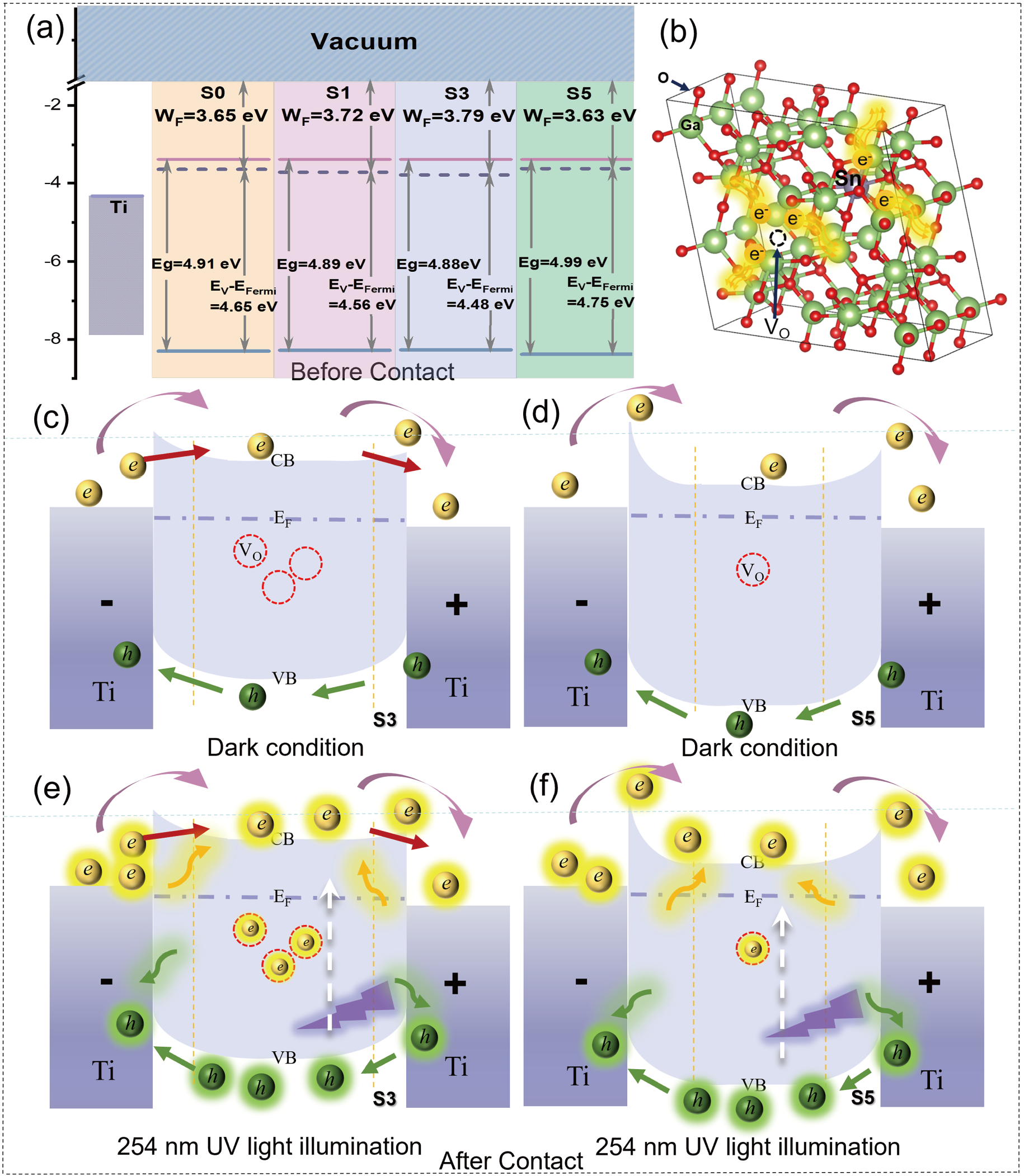 Figure 4. (a) Schematic diagram of energy band structural evolution of S0–S5 samples before contacting with the Ti electrode. (b) Strategy of donor doping to improve conductivity. Operating mechanism of the S3 and S5 devices (c, d) under the dark condition, and (e, f) under UV light illumination with bias after contacting with Ti electrodes.