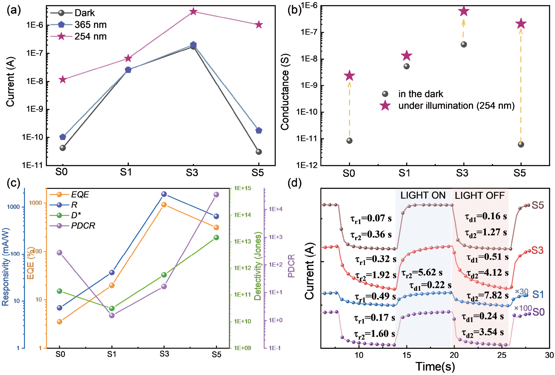 Figure 3. (a) Current and (b) conductance comparison of S0–S5 devices under dark conditions and light illumination. (c) EQE, R, D*, and PDCR comparison of S0–S5 devices. (d) I-t curves of S0–S5 devices.