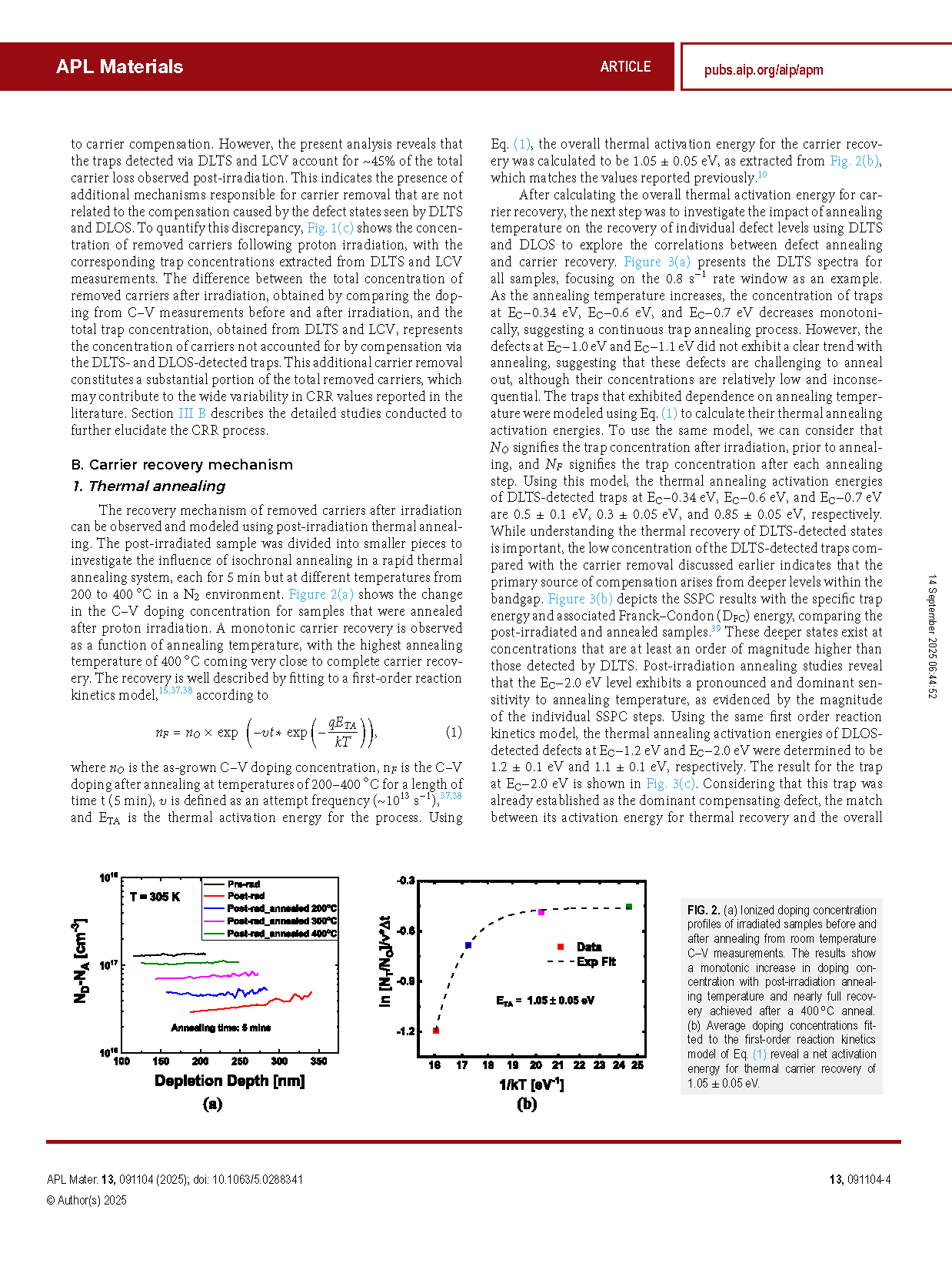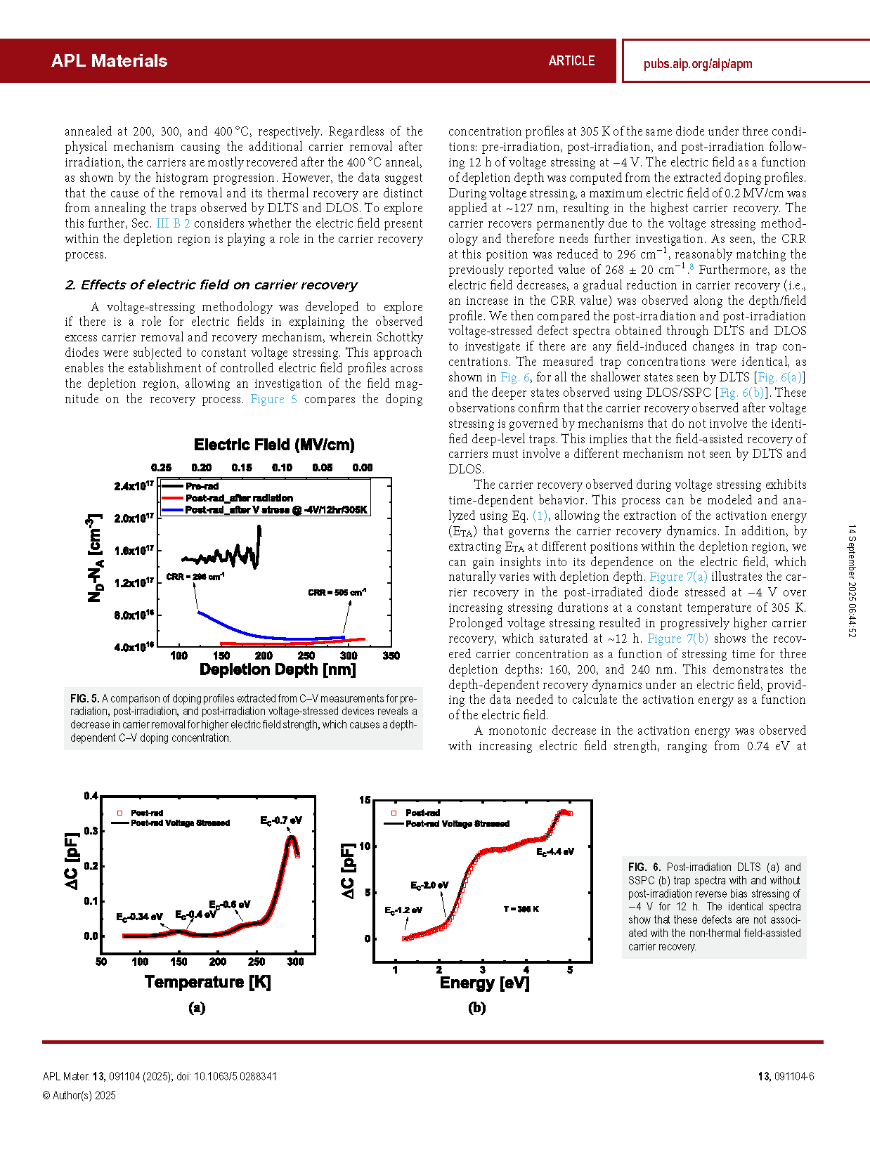 本研究探讨了质子辐照及其后载流子移除与恢复机制对 β-Ga2O3 肖特基二极管的影响。通过电压应力和热退火实现了载流子恢复,为缺陷迁移与载流子补偿机制提供了新见解。在室温下施加电压应力可实现部分载流子恢复,而在 400 °C 无外加电压的条件下则可实现完全恢复。利用深能级瞬态(热)/光谱(DLTS/DLOS)分析发现了辐照引入的关键缺陷态,分别位于 EC−0.34 eV、EC−0.6 eV、EC−0.7 eV、EC−1.2 eV 和 EC−2.0 eV,其中 EC−2.0 eV 是主要的补偿陷阱。 200–400 °C 的等时退火结果表明,这些陷阱的热去除激活能范围为 0.3–1.2 eV。值得注意的是,载流子移除量与辐照后陷阱浓度增加之间存在差异,即陷阱的引入速率滞后于载流子移除速率。尽管这种额外的载流子移除机制尚未明确,且似乎与 DLTS 和 DLOS 检测到的缺陷补偿无关,但其热恢复过程可用一阶反应动力学模型描述,热激活能为 1.0 ± 0.1 eV。 有趣的是,该激活能对耗尽区电场强度非常敏感:在 305 K 下电场仅为 0.2 MV/cm 时,激活能降至 0.13 eV。这表明电场诱导的迁移在载流子移除过程中起到了重要作用。