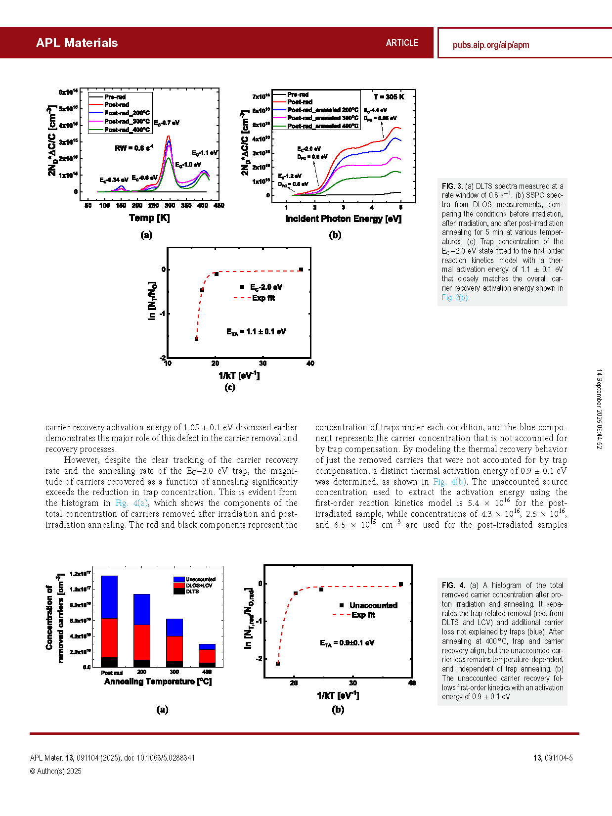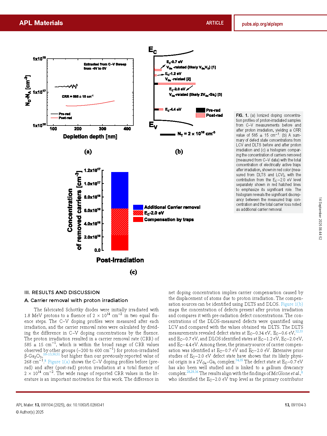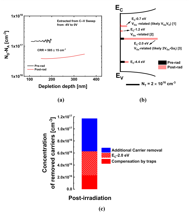 图 1. (a) 质子照射前后样品的电容-电压 (C–V) 测量得到的离子化掺杂浓度分布,显示载流子移除率 (CRR) 为 585 ± 15 cm-1。(b) 照射前后通过低频电容 (LCV) 和深能级瞬态谱 (DLTS) 测得的缺陷态浓度汇总。(c) 直方图比较了移除的载流子浓度(由 C–V 测得)与照射后电活性陷阱总浓度(由 DLTS 和 LCV 测得,红色表示),其中 EC−2.0 eV 能级的贡献用红色虚线突出,显示其主导作用。长方图揭示了测得的陷阱浓度与载流子总损失之间的显著差异,即额外载流子移除现象。