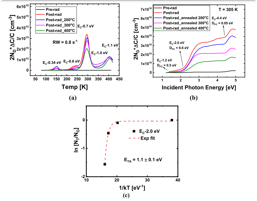 图2 (a) 在速率窗口为 0.8 s-1 下测得的 DLTS 光谱。(b) 通过 DLOS 测量得到的 SSPC 光谱,对比了照射前、照射后以及照射后在不同温度下退火 5 分钟后的情况。(c) EC−2.0 eV 态的陷阱浓度拟合到一阶反应动力学模型,热激活能为 1.1 ± 0.1 eV。