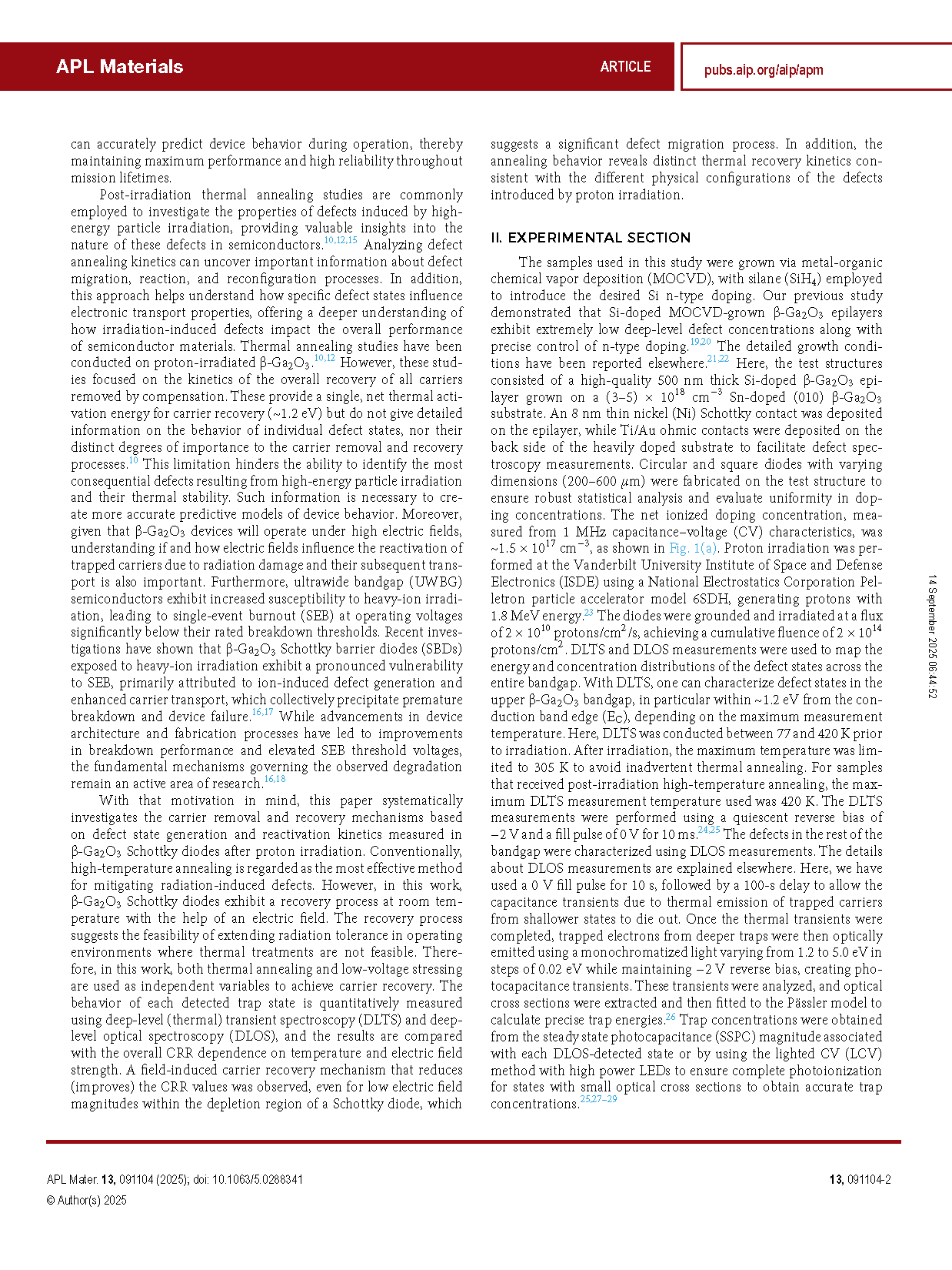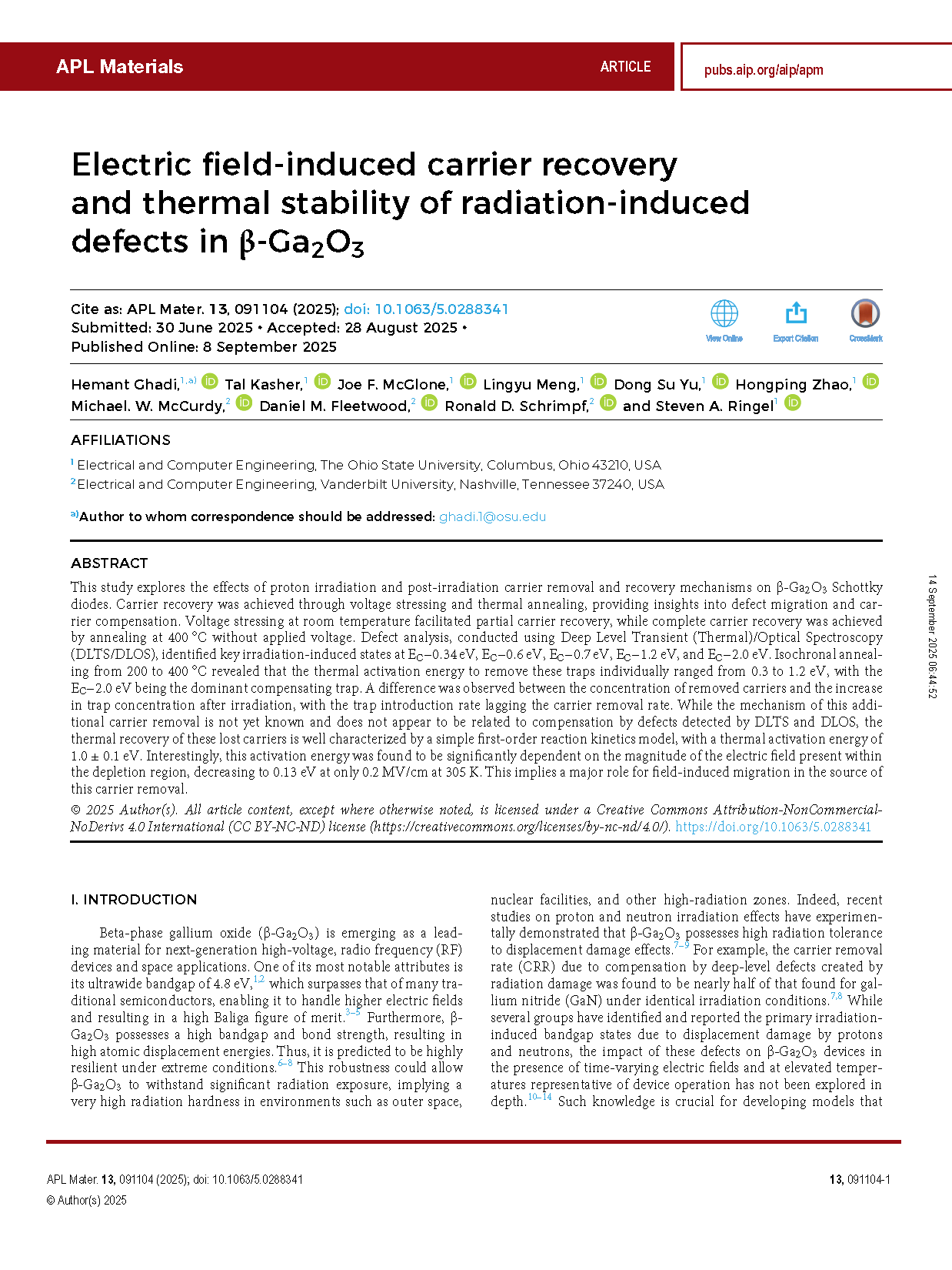 由美国俄亥俄州立大学的研究团队在学术期刊 APL Materials 发布了一篇名为 Electric field-induced carrier recovery and thermal stability of radiation-induced defects in β-Ga2O3(电场诱导载流子恢复及辐射引入缺陷在 β-Ga2O3 中的热稳定性)的文章。