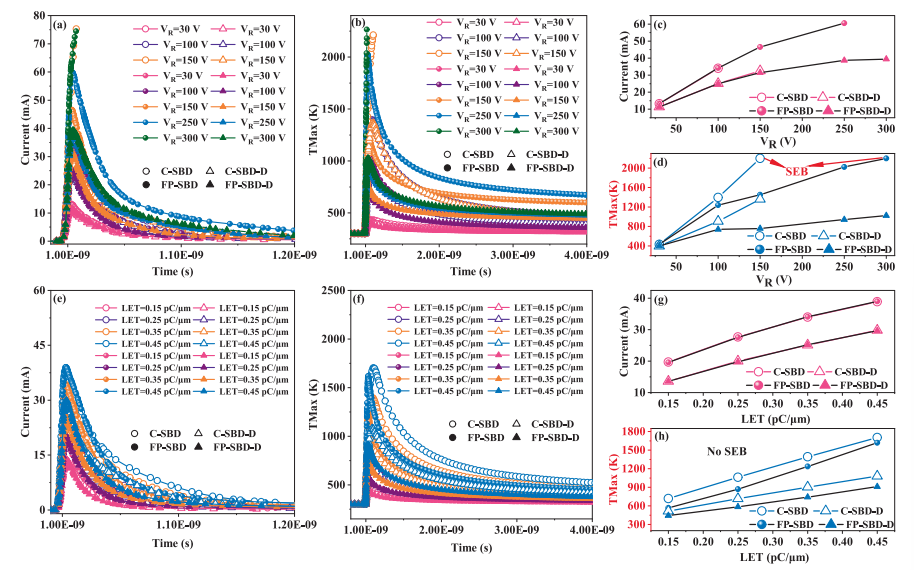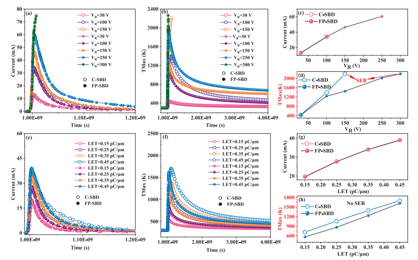 图9. C-SBD-D 与 FP-SBD-D 中瞬态电流与 TMax 随时间的变化:(a)不同 VR 下的瞬态电流,(b)不同 VR 下的 TMax , (c) 最大瞬态电流随 VR 变化的曲线,(d) TMax 随 VR 变化的曲线,(e) 不同 LET 值下瞬态电流的变化,(f) 不同 LET 值下 TMax 的变化,(g) 最大瞬态电流随 LET 变化的曲线,(h) TMax 随 LET 变化的曲线。