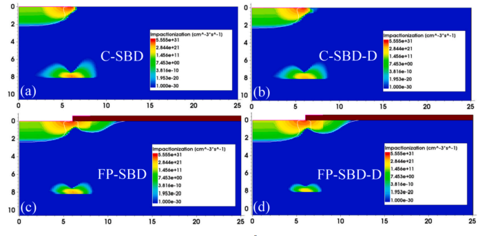 图12. SBD 器件在 t = 1.04 × 10−9 s时的碰撞电离分布:(a)C-SBD 器件,(b)C-SBD-D 器件,(c)FP-SBD 器件,(d)FP-SBD-D 器件。