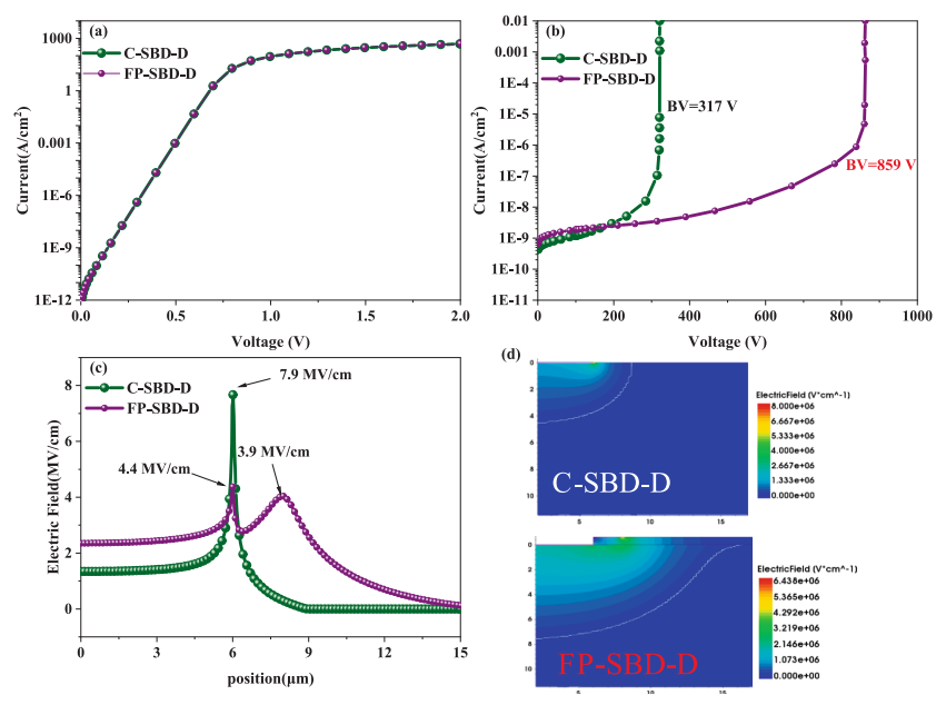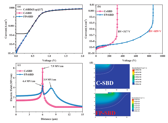 图2. (a)I-V 电学特性、(b)BV 特性、(c)肖特基结表面的电场分布图,以及(d)电场分布矢量仿真的结果。