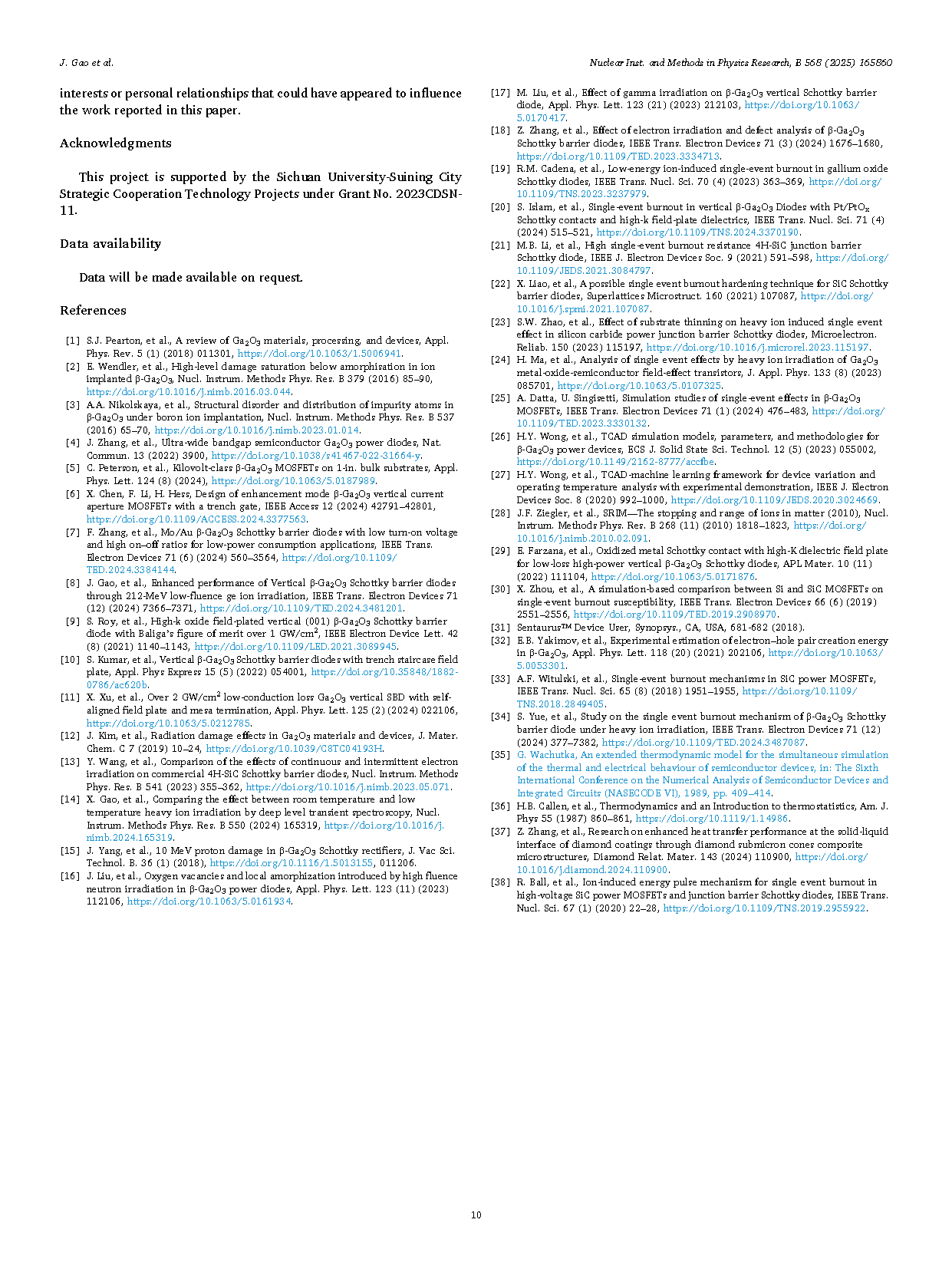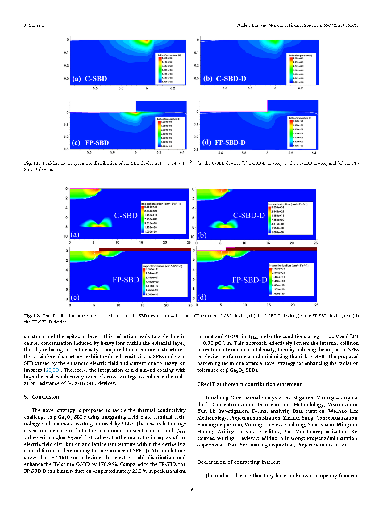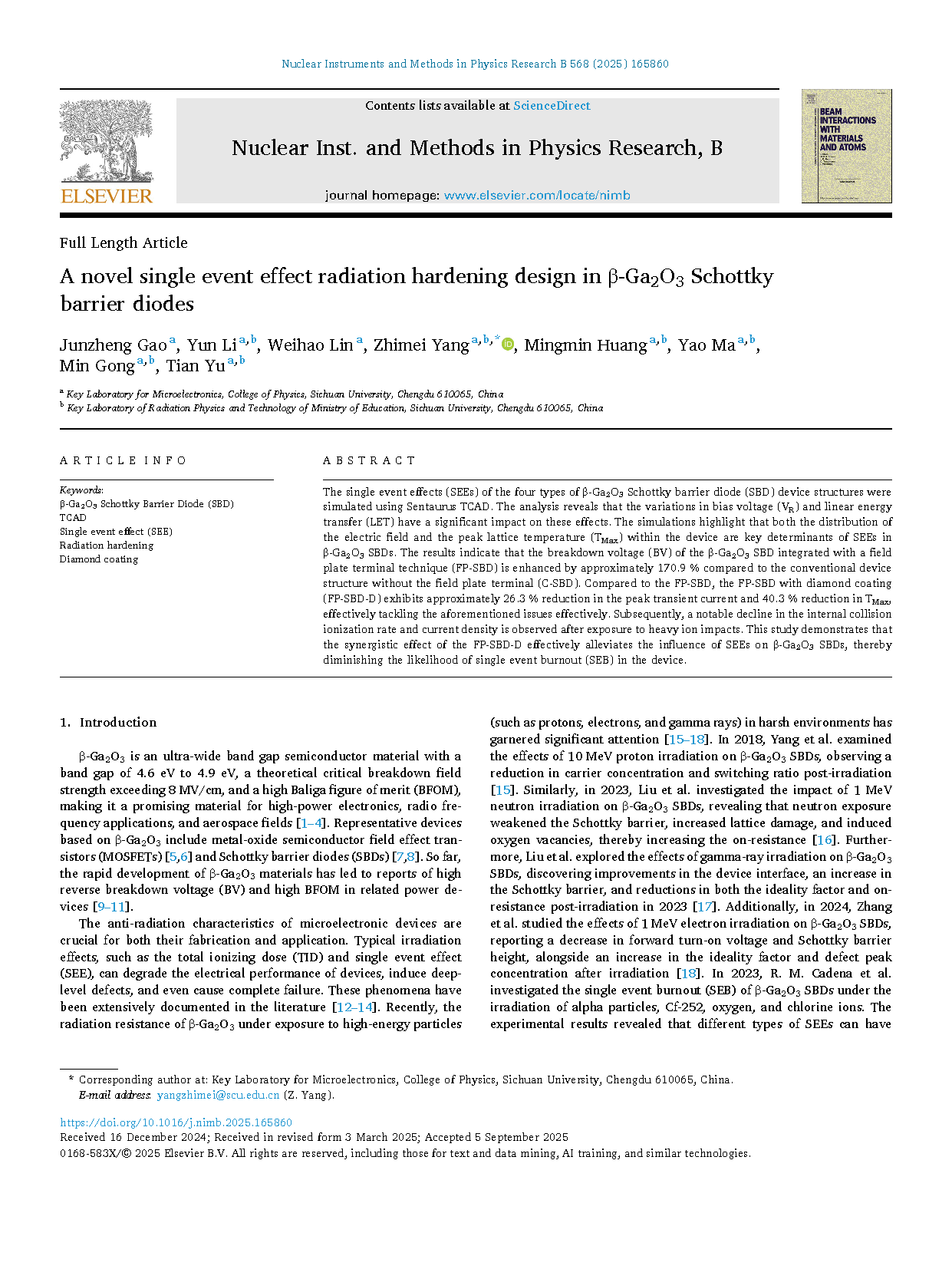 由四川大学的研究团队在学术期刊 Nuclear Instruments and Methods in Physics Research Section B: Beam Interactions with Materials and Atoms 发布了一篇名为 A novel single event effect radiation hardening design in β-Ga2O3 Schottky barrier diodes(新型 β-Ga2O3 肖特基势垒二极管的单粒子效应与辐射加固设计)的文章。