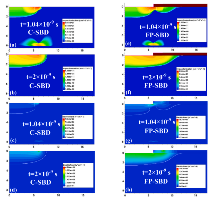 图5. C-SBD和FP-SBD两种器件在不同时间的碰撞电离率与电场强度分布:C-SBD(a) t = 1.04 × 10−9 s和(b) t = 2 × 10−9 s时C-SBD碰撞电离率分布;(c) t = 1.04 × 10−9 s和 (d) t = 2 × 10−9 s 时电场强度分布;FP-SBD(e) t = 1.04 × 10−9 s 和 (f) t = 2 × 10−9 s时碰撞电离率分;(g) t = 1.04 × 10−9 s 和 (h) t = 2 × 10−9 s时电场强度分布。
