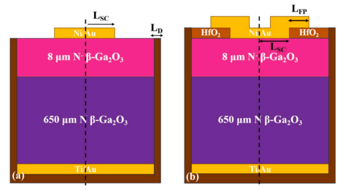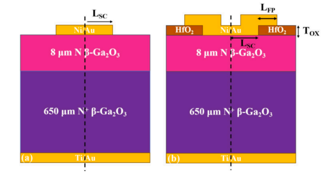 图1. β-Ga2O3 SBD器件结构图:(a) C-SBD,(b) FP-SBD。