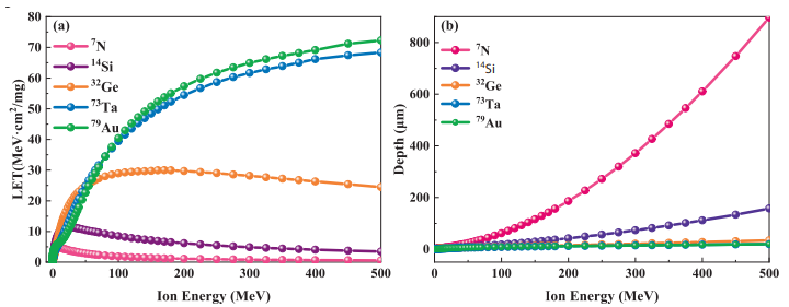图3. (a) 不同类型重离子入射能量与LET的关系,以及 (b) 不同重离子入射深度随入射能量的变化。