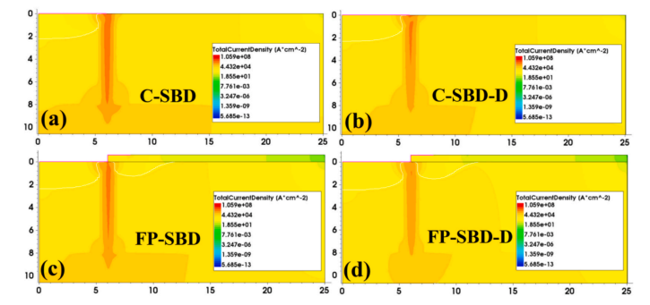 图10. t = 1.04 × 10−9 s 时 SBD 器件的总电流密度分布:(a)C-SBD 器件,(b)C-SBD-D 器件,(c)FP-SBD 器件,(d)FP-SBD-D 器件。