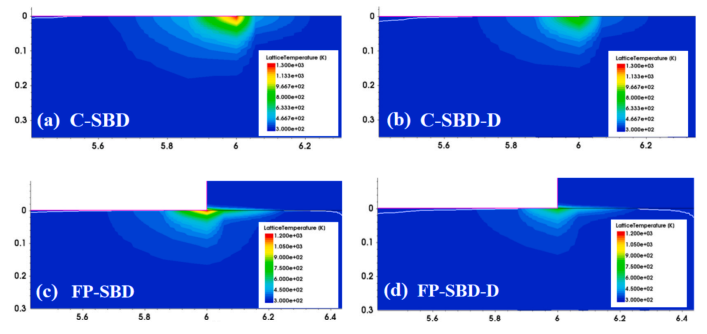 图11. t = 1.04 × 10−9 s时 SBD 器件的峰值晶格温度分布:(a)C-SBD 器件,(b)C-SBD-D器件,(c)FP-SBD 器件,(d)FPSBD-D 器件。