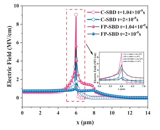 图6. 当VR =100 V,LET= 0.35 pC/μm时,C-SBD与FP-SBD不同时刻肖特基结表面电场分布图。