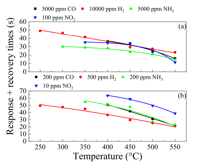 图 7. ZGO 薄膜在高浓度 (a) 和低浓度 (b) 气体下,响应时间 (tres) 与恢复时间 (trec) 总和随温度变化的关系。