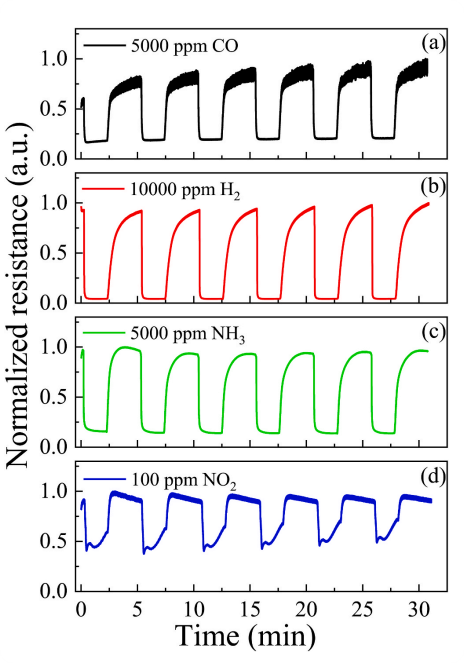 图 10. nc-ZGO 薄膜在 T = 500 ℃ 下循环暴露于 CO (a)、H2 (b)、NH3 (c)、NO2 (d) 气体时,电阻随时间的变化关系。
