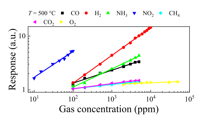 图 8. nc-ZGO 薄膜在 T = 500 ℃ 下对不同气体浓度的响应依赖性。