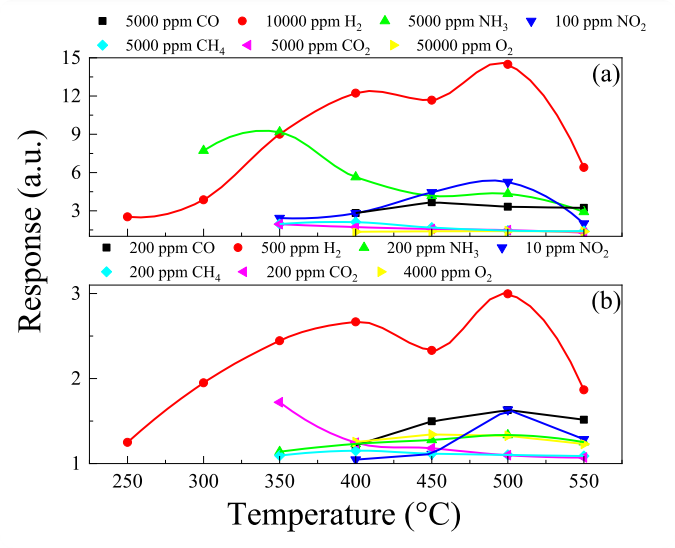 图 6. 纳米晶 Zn 掺杂 Ga2O3 (nc-ZGO) 薄膜对不同气体在高浓度 (a) 和低浓度 (b) 下的响应随温度变化的关系。