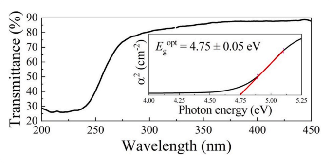 图 5. 纳米晶 ZGO 薄膜的典型透射光谱图。插图显示吸收系数 α2 与光子能量的关系。