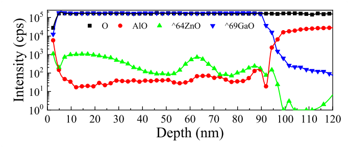 图 2. 纳米晶 ZGO 薄膜在蓝宝石衬底上的 SIMS 深度剖面图。