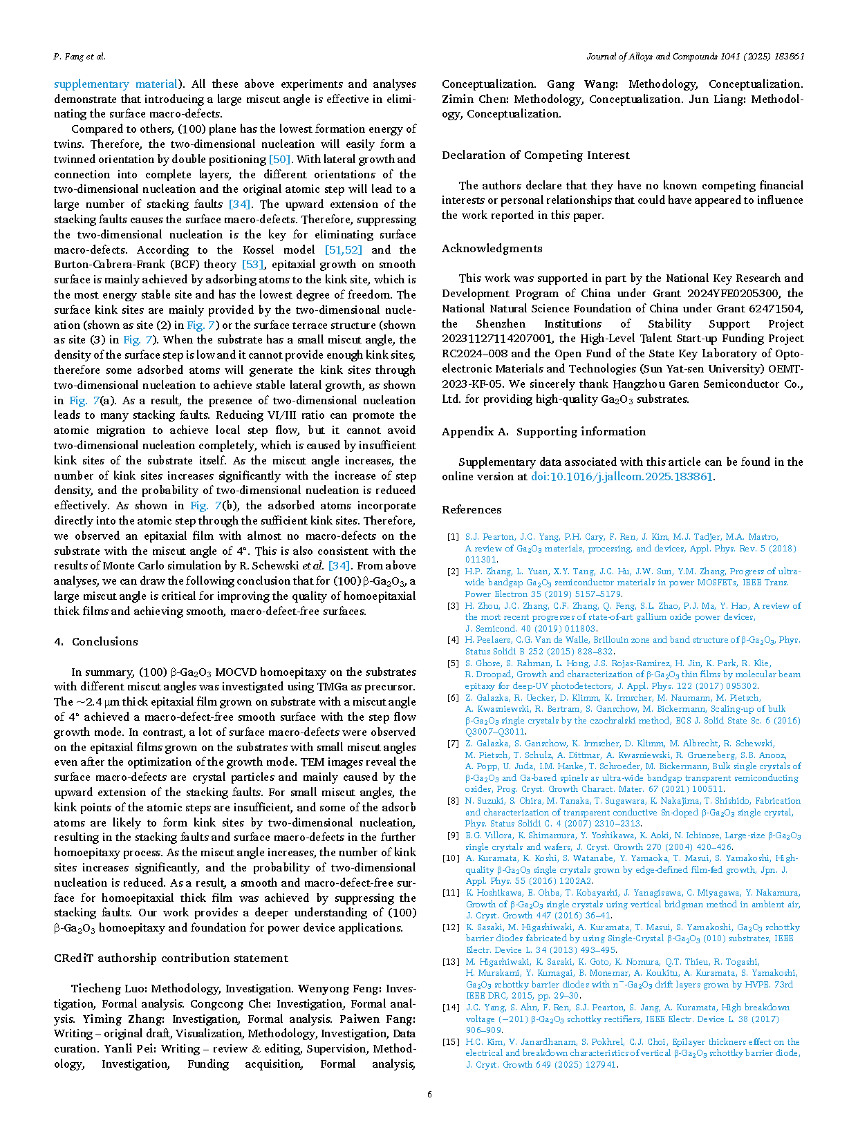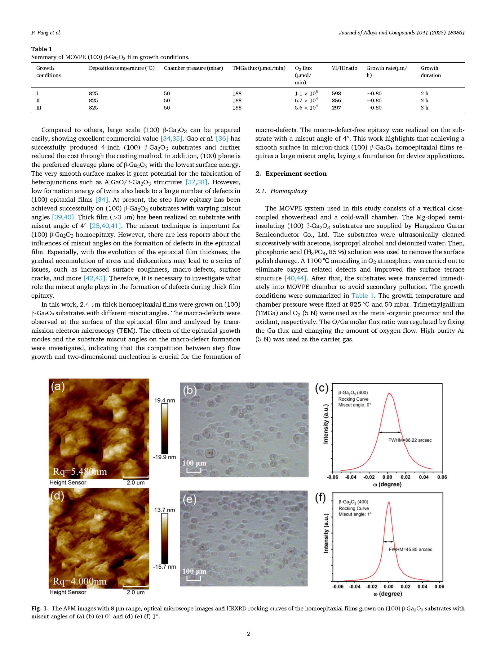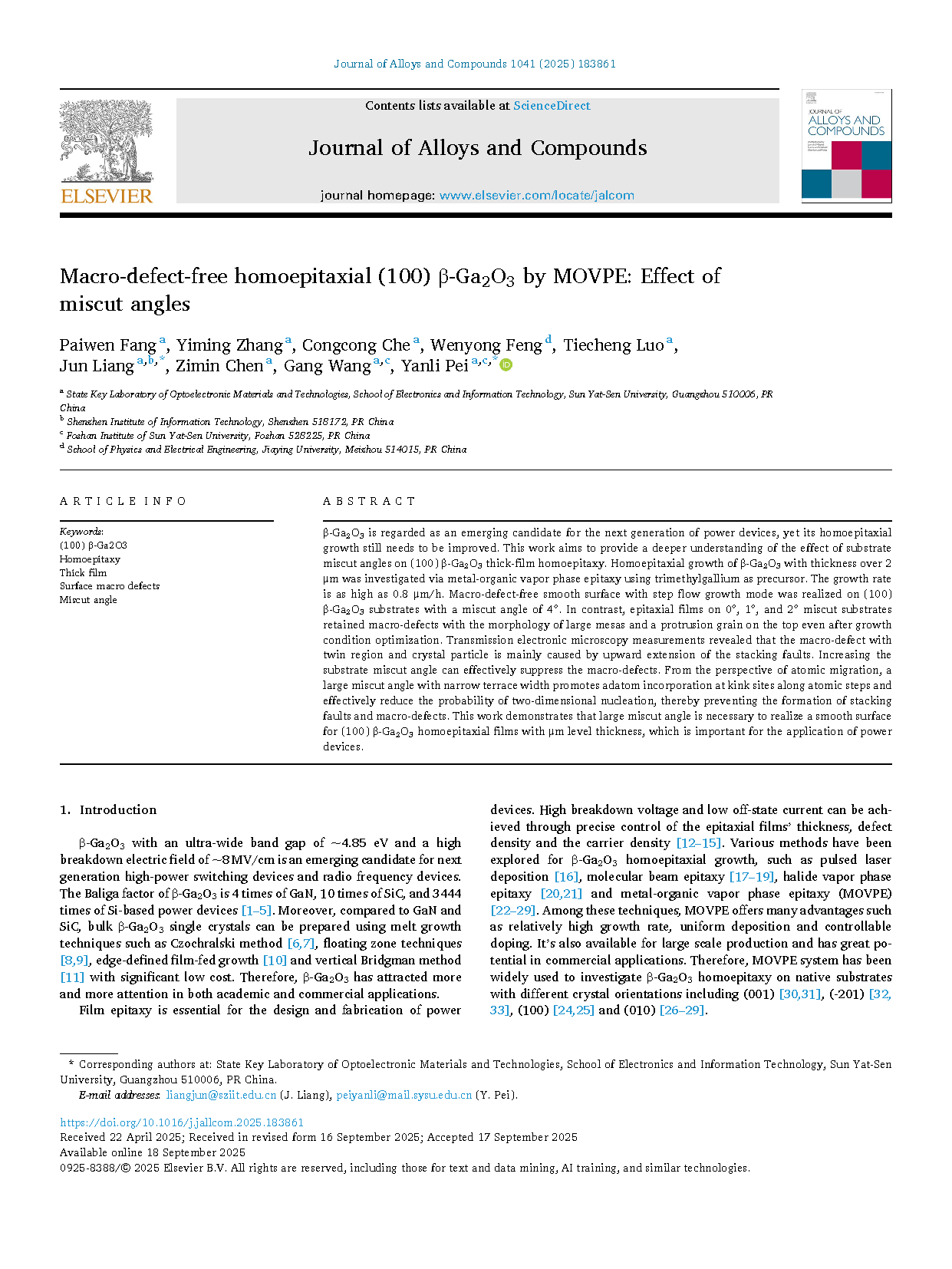 由中山大学裴艳丽教授、王钢教授团队联合深圳信息职业技术大学在学术期刊 Journal of Alloys and Compounds 发布了一篇名为 Macro-defect-free homoepitaxial (100) β-Ga2O3 by MOVPE: Effect of Miscut angles(基于 MOVPE 法获得的宏观缺陷自由同质外延 (100) β-Ga2O3 薄膜:倾斜切割角度的影响)的文章。方湃文为文章第一作者。