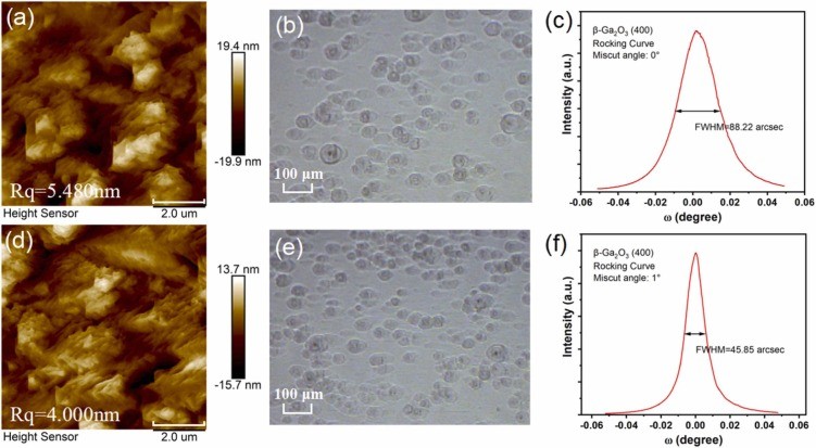 图1. 在切角为 (a) (b) (c) 0° 和 (d) (e) (f) 1° 的 (100) β-Ga2O3 衬底上生长的同质外延薄膜的 8 μm 范围原子力显微镜图像、光学显微镜图像及高分辨率X射线衍射摇摆曲线。