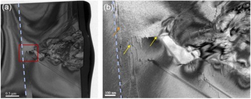 图3. (a) 1° 切角样品表面宏观缺陷的透射电子显微镜横截面图像;(b) (a) 图中红框区域的放大图像。