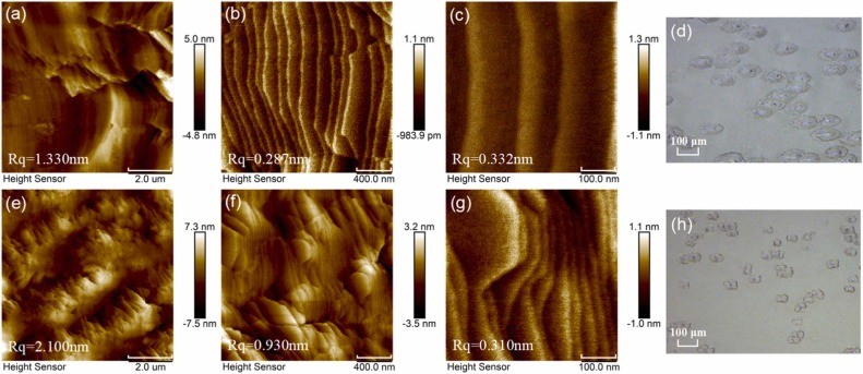 图4. 在生长条件 II 下,于无切角的 (100) β-Ga2O3 衬底上生长的 β-Ga2O3 薄膜的 (a) 8 μm、(b) 2 μm和 (c) 0.5 μm 范围内的 AFM 图像以及 (d) 光学显微镜图像。在生长条件III下,具有 1° 切角的 (100) β-Ga2O3 衬底上生长的 β-Ga2O3 薄膜的 (e) 8 μm、(f) 2 μm 和 (g) 0.5 μm 范围内的 AFM 图像以及 (h) 光学显微镜图像。