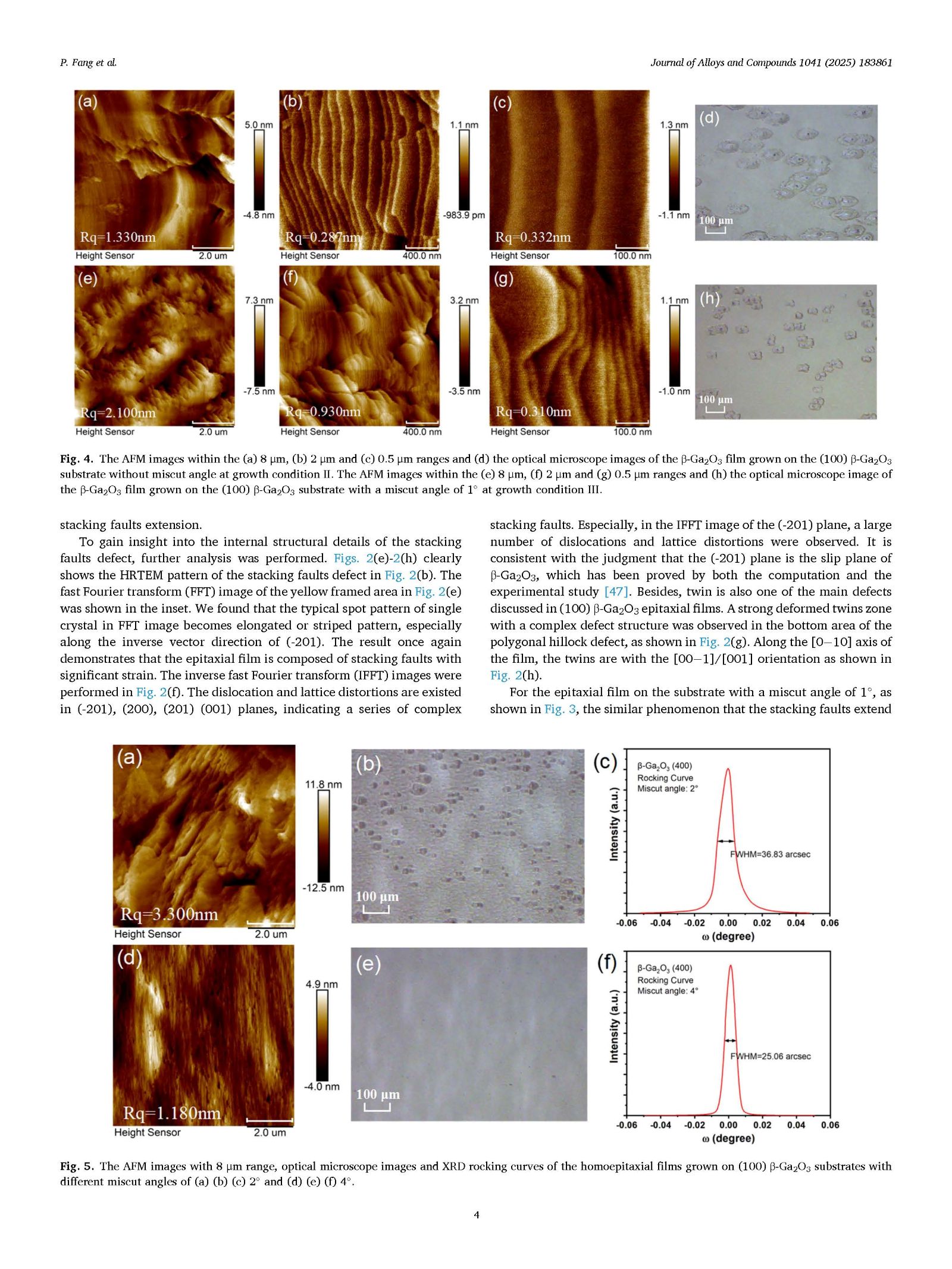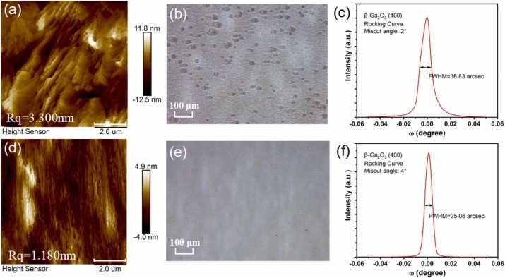 图5. 在不同切角的 (100) β-Ga2O3 衬底上生长的同质外延薄膜的原子力显微镜图像(扫描范围8 μm)、光学显微镜图像及X射线衍射摇摆曲线:(a) (b) (c) 2° 切角;(d) (e) (f) 4° 切角。