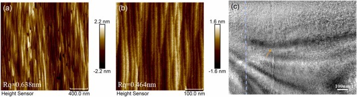 图6. 具有 (a) 2 μm 和 (b) 0.5 μm 范围的原子力显微镜图像,(c) 在4° 切角的 (100) β-Ga2O3 衬底上生长的外延薄膜的截面透射电子显微镜图像。
