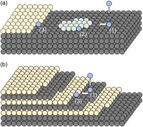 图7. 在 (100) β-Ga2O3 衬底上同质外延生长过程示意图,其中 (a) 为小切角,(b) 为大切角。