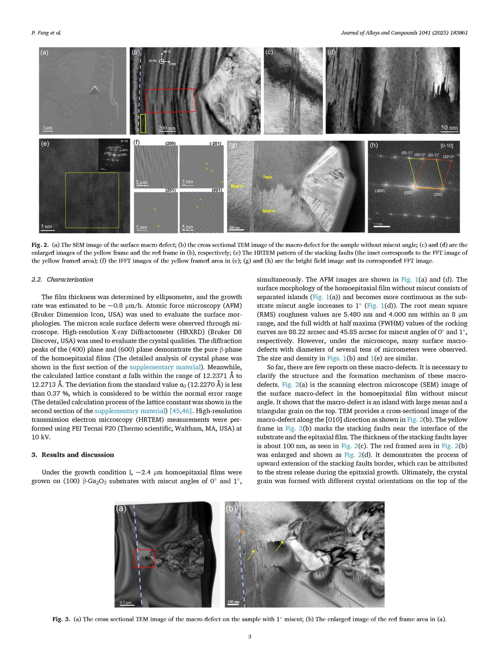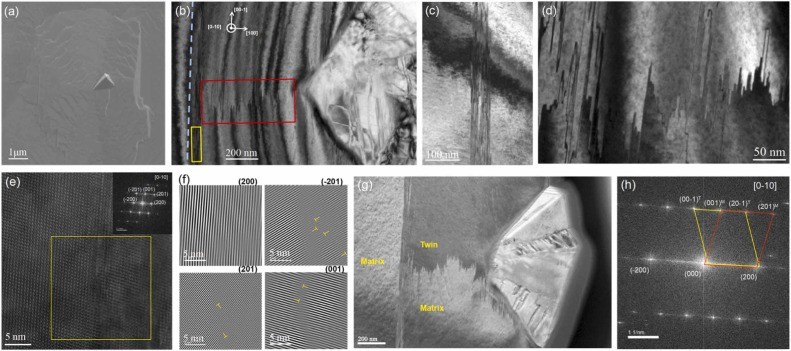 图2. (a) 表面宏观缺陷的扫描电子显微镜图像;(b) 无误切角样品宏观缺陷的透射电子显微镜截面图像;(c) 和 (d) 分别是 (b) 图中黄色框和红色框的放大图像; (e) 堆叠层错的HRTEM衍射图案(插图对应黄框区域的FFT图像);(f) (e) 中黄框区域的IFFT图像;(g) 和 (h) 分别为明场图像及其对应的 FFT 图像。