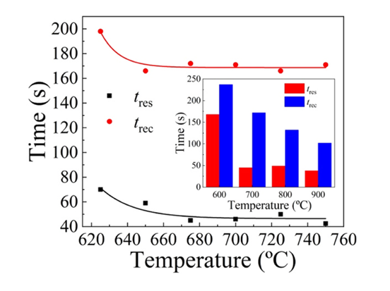 图 6. 多晶 β-Ga2O3 在 5 vol% O2 条件下的响应与恢复时间随温度的变化:T = 625–750℃ 范围及 T = 600–900℃ 范围(插图)。