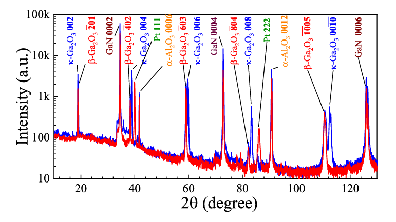 图 2. 由 HVPE 在 630℃ 下生长的 Ga2O3/GaN/Al2O3 异质外延结构的 XRD 图谱:原始样品(蓝色曲线);在空气中 1000℃ 退火 30 min 后的样品(红色曲线)。