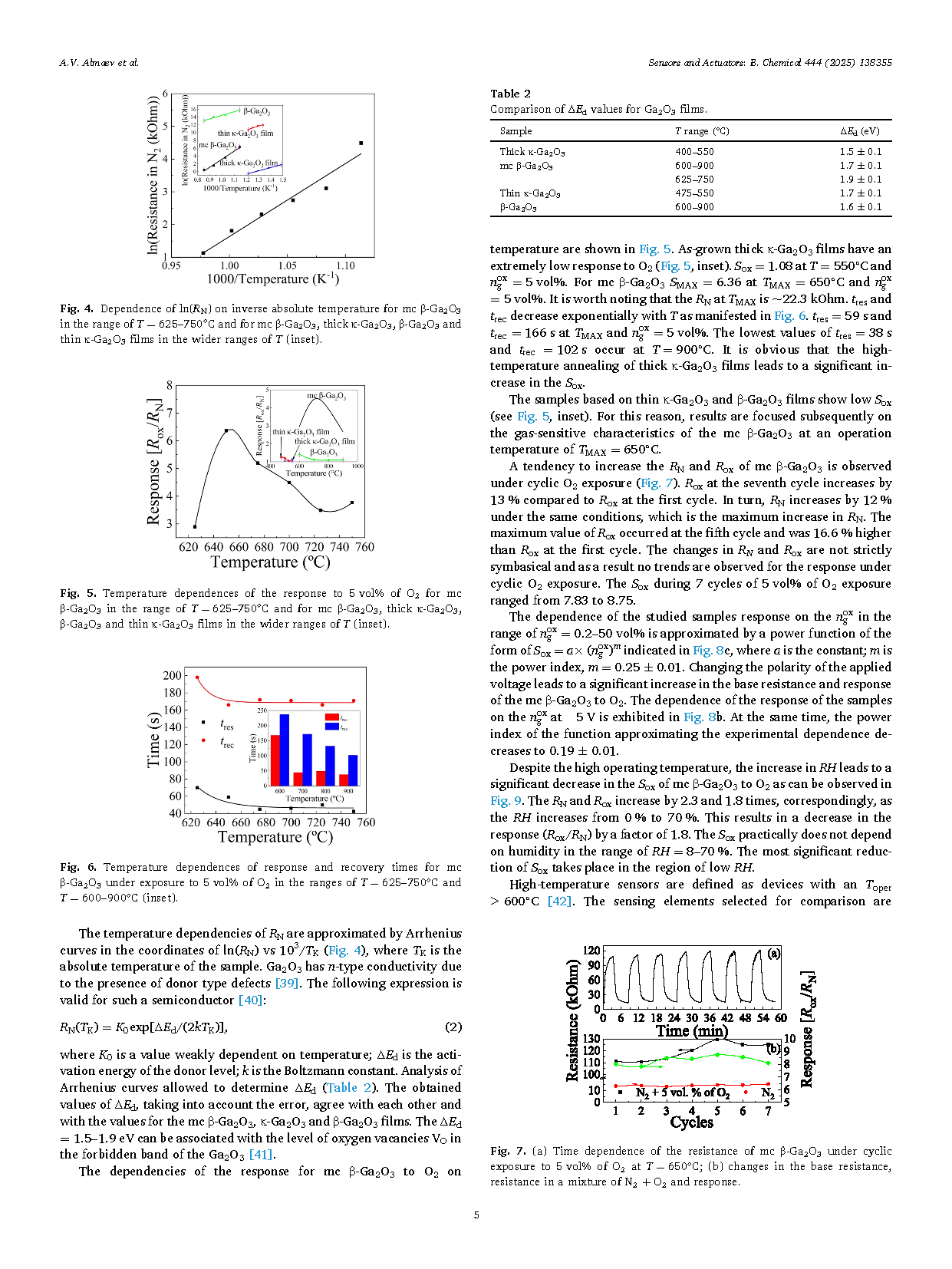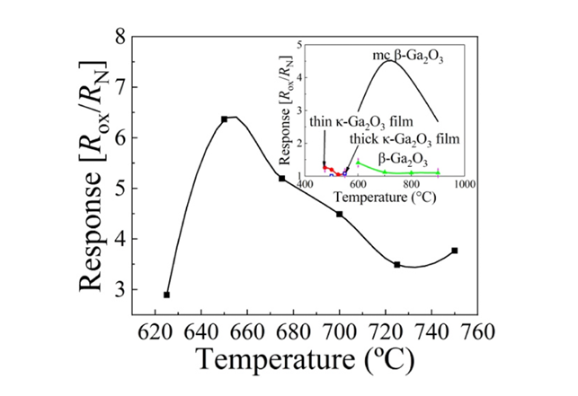 图 5. 多晶 β-Ga2O3 在 T = 625–750℃ 范围内对 5 vol% O2 的响应的温度依赖性,以及多晶 β-Ga2O3、厚 κ-Ga2O3、β-Ga2O3 和薄 κ-Ga2O3 薄膜在更宽温度范围内的对比结果(插图)。