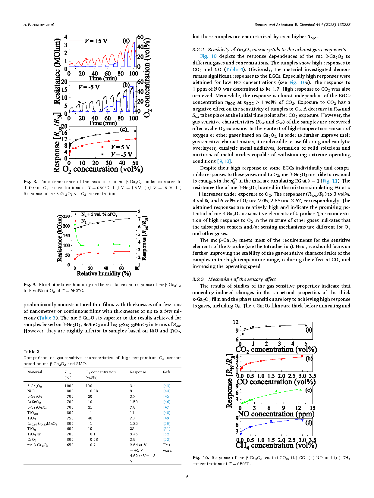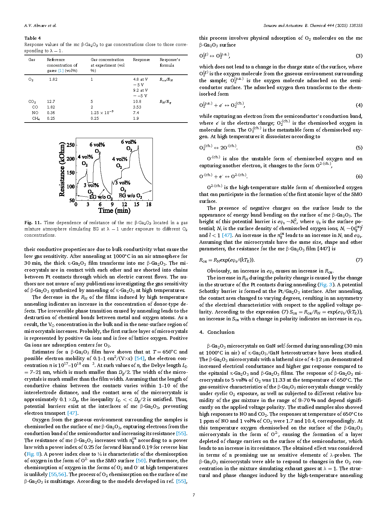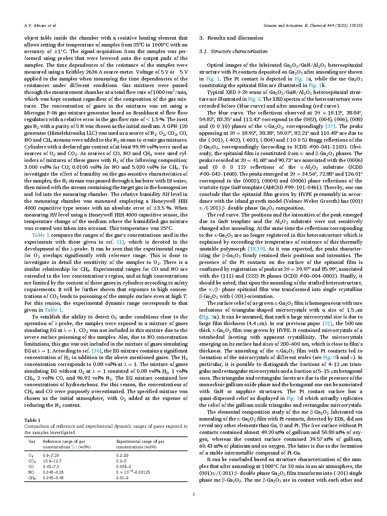 在本研究中,详细探讨了通过在 GaN/Al2O3 衬底上生长的 κ-Ga2O3 厚膜经 1000 °C 退火获得的 β-Ga2O3 微晶的气敏特性。实验表明,在空气气氛中 1000 °C 退火 30 分钟后,κ-Ga2O3/GaN 异质结构中自发形成了 β-Ga2O3 微晶。这些横向尺寸为 4–12 µm 的 β-Ga2O3 微晶相较于外延 κ-Ga2O3 和 β-Ga2O3 薄膜表现出更高的电导率和气体响应。在 650 °C 下,β-Ga2O3 微晶对 5 vol.% O2 的响应值达到 11.33。其气敏特性在循环 O2 暴露下变化较小,并且在 8–70% 相对湿度范围内稳定,但对外加电压极性较为敏感。此外,样品还对 NO 和 CO2 表现出较高响应,在 650 °C 下对 1 ppm NO 和 1 vol.% CO2 的响应值分别为 1.7 和 10.4。在该温度下,氧以 O2⁻ 的形式吸附在 β-Ga2O3 微晶表面,导致半导体表面形成一个载流子耗尽层,从而增加了其电阻。上述效应表明 β-Ga2O3 微晶作为 λ 探针的敏感元件具有潜在应用前景。实验还表明,β-Ga2O3 微晶能够对模拟废气中 λ = 1 条件下 O2 浓度的变化作出响应。进一步分析表明,高温退火引起的结构和相变是 β-Ga2O3 微晶对 O2 高灵敏度的关键因素。