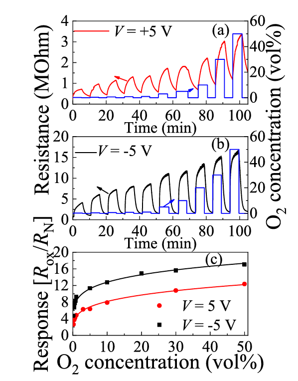 图 8. 多晶 β-Ga2O3 在 T = 650℃ 下暴露于不同 O2 浓度时的电阻随时间变化:(a)V = +5 V;(b)V = –5 V;(c)响应值随 O2 浓度的变化关系。