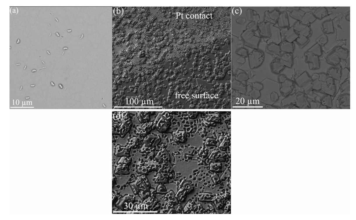 图 3. (a) 原始生长的 κ-Ga2O3 薄膜的 SEM 俯视图;(b) 退火 κ-Ga2O3 薄膜所得的多晶 β-Ga2O3,包含自由表面区域与覆盖 Pt 电极区域;(c) 自由表面区域的放大图像;(d) Pt 电极区域的放大图像。