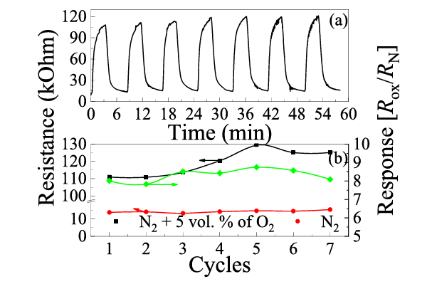 图 7. (a) 多晶 β-Ga2O3 在 T = 650℃ 下,循环暴露于 5 vol% O2 时的电阻随时间变化;(b) 基线电阻、在 N2+O2 混合气氛下的电阻及响应值的变化情况。