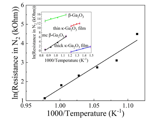 图 4. 多晶 β-Ga2O3 在 T = 625–750℃ 范围内的 ln(RN) 与绝对温度倒数的关系,以及多晶 β-Ga2O3、厚 κ-Ga2O3、β-Ga2O3 和薄 κ-Ga2O3 薄膜在更宽温度范围内的对比关系(插图)。