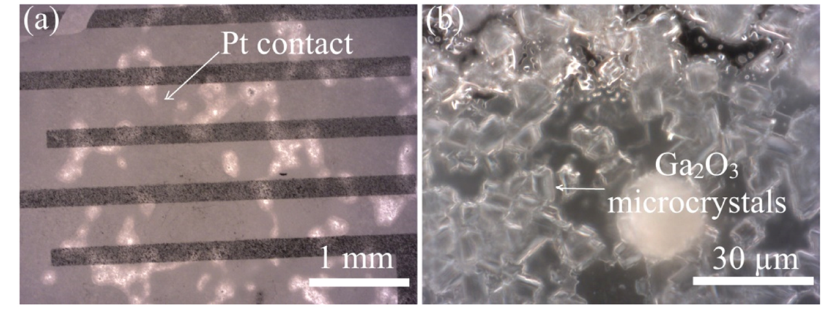 图 1. Ga2O3/GaN/Al2O3 异质外延结构在退火后沉积 Pt 电极的光学图像:(a)Pt 电极;(b)多晶 β-Ga2O3。