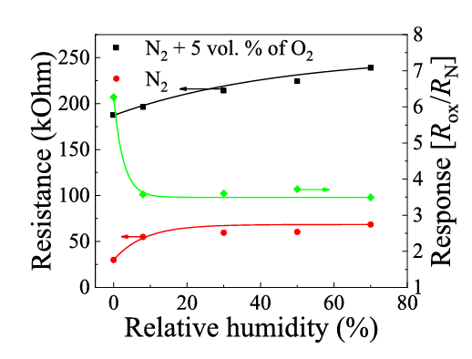 图 9. 相对湿度对多晶 β-Ga2O3 在 T = 650℃ 下对 5 vol% O2 的电阻及响应的影响。