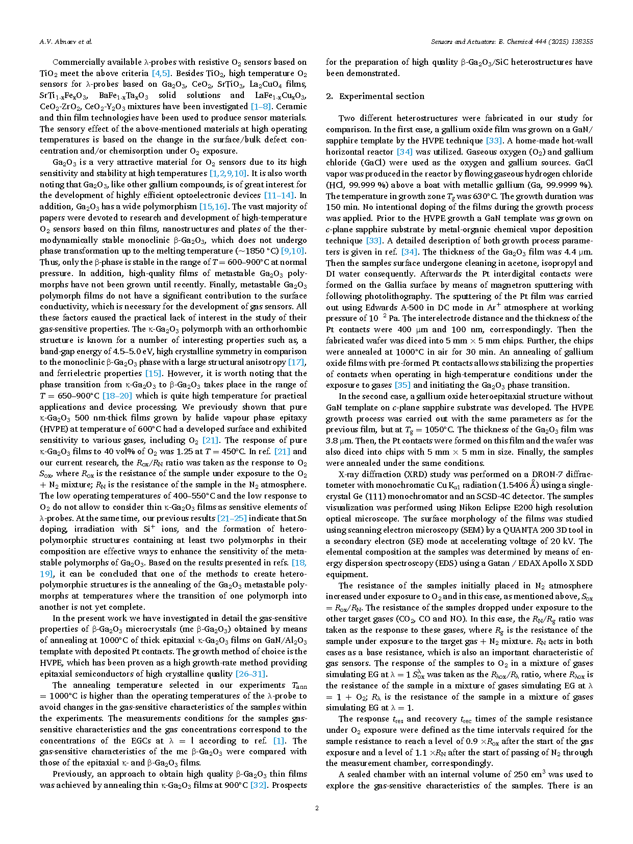 单斜相 β-Ga2O3 由于其高灵敏度和高稳定性,是制备高温 O2 传感器的极具吸引力的材料。相比之下,其他 Ga2O3 多晶型薄膜的亚稳态导致其气敏特性研究几乎缺乏实际应用价值。研究者此前已表明,通过卤化物气相外延(HVPE)方法生长的厚度为 500 nm 的纯 κ-Ga2O3 薄膜具有发达的表面形貌,并表现出对包括 O2 在内的多种气体的灵敏性。然而,其工作温度较低(400–550 °C),且对 O2 的响应较弱,因此 κ-Ga2O3 薄膜尚不足以作为 λ 探针的敏感元件。同时,研究者先前研究结果表明,形成至少包含两种多晶型的异质多晶结构是增强 Ga2O3 亚稳态多晶型气敏性能的有效途径。可以得出结论,形成异质多晶型结构的方法之一是在一种多晶型物向另一种多晶型物转变尚未完成的条件下对 Ga2O3 亚稳态多晶型物进行退火处理。